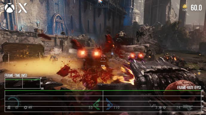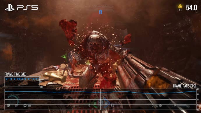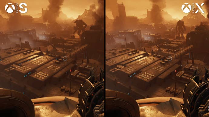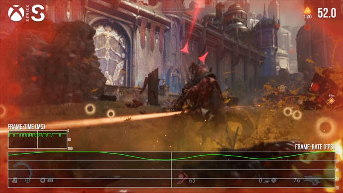 Performance is not quite as good as Series X. The great majority of gameplay still runs at 60fps, thankfully, but there are dips, particularly in larger gameplay spaces. This open-air fight at the outset of level 6 is a good example, with many dips into the 50s in this sequence. Expect similar results during this interior face-off in level 2, which is unexpectedly heavy. I didn’t have time to get as far in Dark Ages as I’d like, but I would expect similar behaviour in other taxing fights. Series S also suffers from some screen-tearing artifacts near the top of the screen, which present oddly and aren’t possible to track with our tools. These are not terribly noticeable but you can spot them if you go hunting for them. It’s possible Series X has similar behaviour, but it doesn’t drop frames nearly as often, if at all, so there would be little opportunity to witness them.