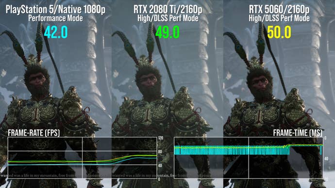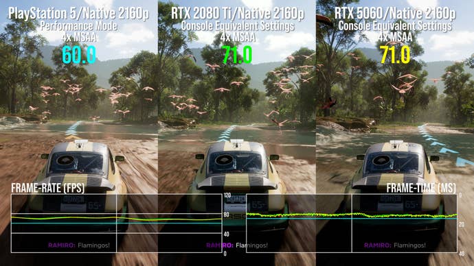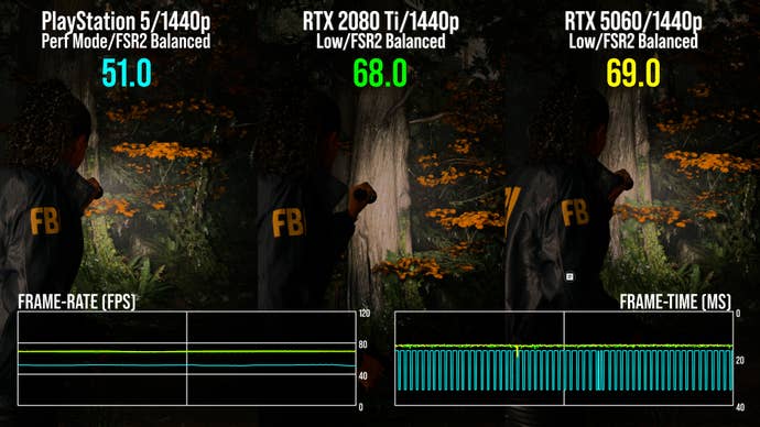 I also spent some time doing some custom testing, similar to the RTX 5060 review, starting with PlayStation 5 console comparisons. So, here’s the thing. Generally speaking, console performance trends upwards against equivalent PC parts. The PlayStation 4’s GPU is effectively a customised Radeon HD 7850/7870 hybrid – but the results in the mid to late era of the console’s lifespan effortlessly outstrip what those GPUs produced. The RTX 2080 Ti not only predated the current-gen consoles by two years, but getting on for five years after their launch, it continues to power past their capabilities.