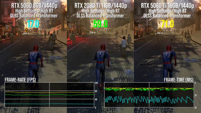 The RTX 2080 Ti also seems to answer the question of how much VRAM is appropriate for a card of this class. Even at 1080p resolution, we can find examples of the RTX 5060’s 8GB of framebuffer memory falling short, but looking at Marvel’s Spider-Man 2 and Monster Hunter Wilds specifically as examples, it highlights that while the raw horsepower is there to produce decent frame-rates with ray tracing active, you need more than 8GB to get the job done. While 12GB is more common, 11GB seems enough to make these games run well and to ace our benchmark suite where the RTX 5060 falls short.