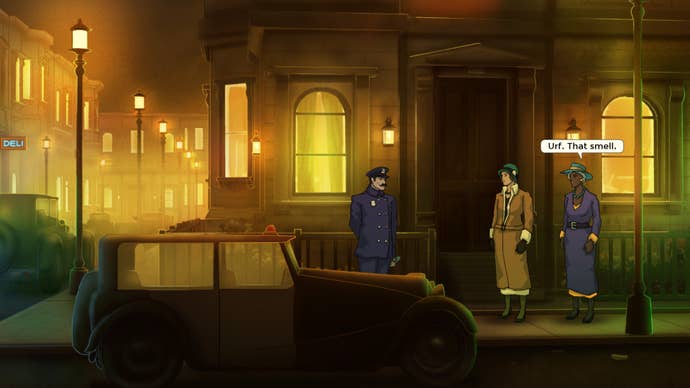 There’s romance, mystery, farce, intrigue, subterfuge, and even a spot of murder as Old Skies gamely leaps between genres – often multiple times within each tale – and Fia hurtles through New York’s history, each era brought to life by a wonderful jazz noir soundtrack, and some beautifully evocative art. This is Wadjet Eye’s first HD game (three times the resolution of Unavowed, its marketing material exclaims!) and the studio doesn’t waste a pixel as its story leaps from its gleaming, pink-skied vision of the future to the cobblestone streets of the 1870s; from the smoke-wrapped speakeasies of Prohibition era 1920s to a New York in the shadow of the Twin Towers on 10th September 2001, and beyond. It’s lovely stuff, invoking the spirit of each era rather than attempting to slavishly replicate them.